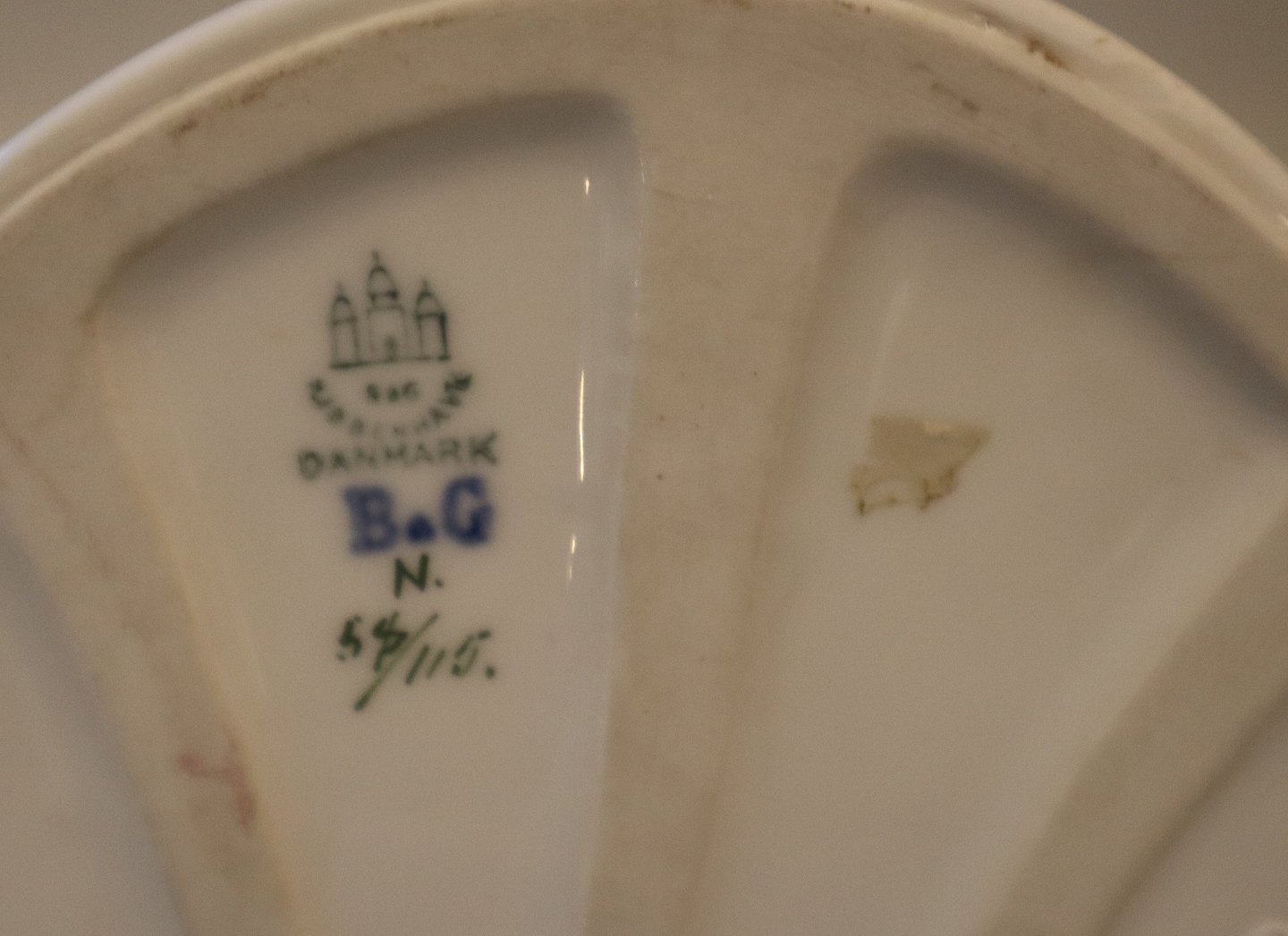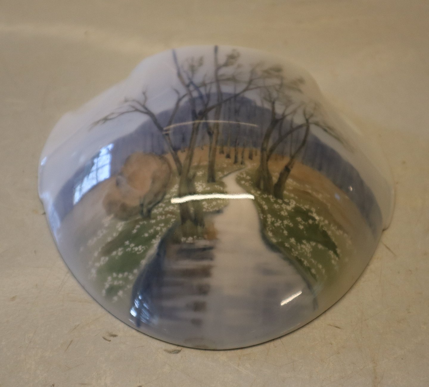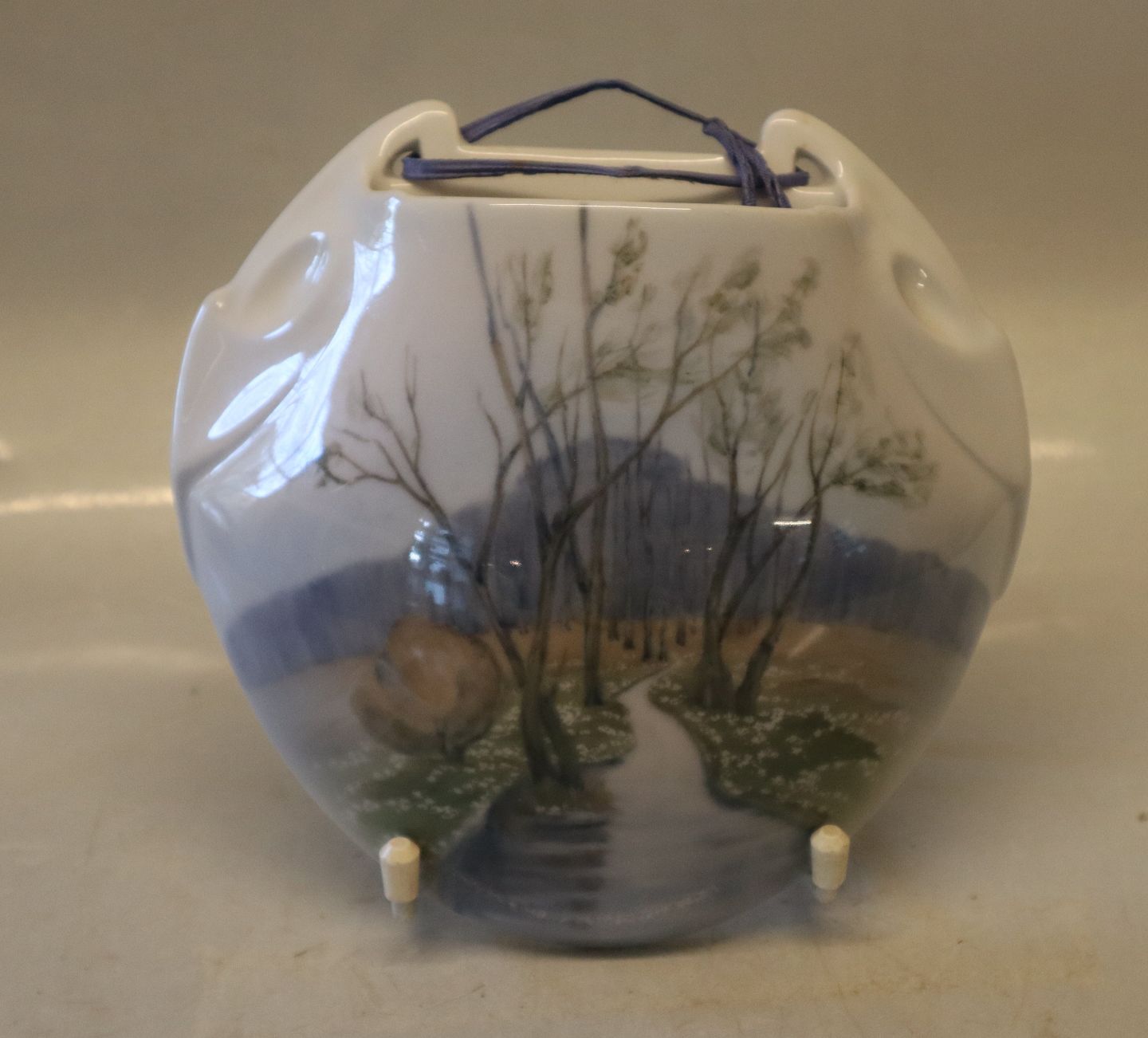 Description: B&G 115-58 Art Nouveau Wall pocket - hanging vase 18 x 18 cm Trees by by a small river Bing and Grondahl Marked with the three Royal Towers of Copenhagen. Bing & Groendahl In mint and nice condition