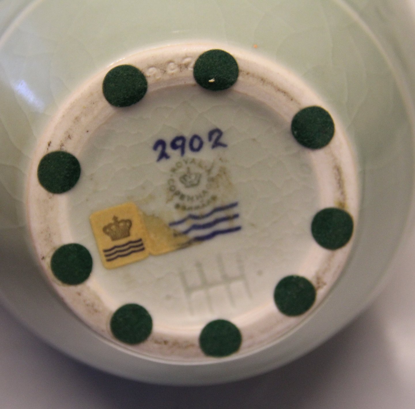 Beskrivelse: Royal Copenhagen stentøj 2902 Kgl. Grøn Krakkeleret Celadon med egeblade i relief 18 cm signeret HHH